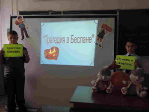 Именно с этих слов начался Урок мужества в школе, дети рассуждали о случившейся беде, посмотрели фильм о той страшной трагедии, приняли участие в конкурсе рисунков на асфальте «Не отнимайте солнца у детей».