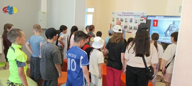Этот день начался с зарядки Героя, которую проводили ребята, чьи родственники находятся на СВО. Родителей участников СВО воспитанники лагеря посетили на дому, вручив открытки с поздравлениями и словами благодарности за воспитание сыновей, защищающих нас.