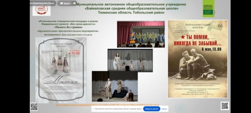 Директор МАОУ «Байкаловская СОШ»  Кугаевская Елена Дмитриевна поделилась с участниками семинара-совещания уникальным опытом возглавляемой ею образовательной организации. В 2024 году школе присвоен статус «Опорная площадка проекта «Без срока давности» в субъекте Российской Федерации». Тесное сотрудничество в рамках проекта с Президентской библиотекой обеспечило доступ ученикам школы к миллиону архивных материалов. Елена Дмитриевна отметила важность реализации проекта «Использование ресурсов «Президентской библиотеки имени Б.Н. Ельцина» в образовательной организации, имеющей статус «Опорная площадка проекта «Без срока давности» в субъекте Российской Федерации», для патриотического воспитания подрастающего поколения.