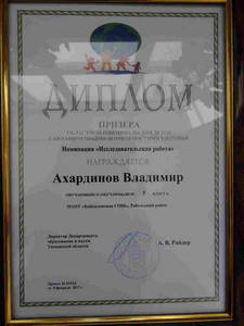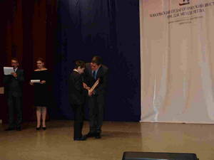 10 марта в Тобольском педагогическом институте им. Д.И.Менделеева состоялось торжественное чествование призеров и победителей регионального этапа Всероссийской олимпиады школьников и олимпиады для детей с ограниченными возможностями здоровья. С поздравлением к победителям обратился губернатор Тюменской области В.В.Якушев. Ученики нашей школы Ахардинов Владимир и Дмитриев Денис получили дипломы, медали и премию из рук заместителя главы Тобольского района по социальным вопросам М.И. Бакиева. Владимир занял 2 место среди учащихся 5-9 классов в номинации "Исследовательская работа", Денис - 1 место в номинации "Художественное творчество" среди 1-4 классов.