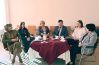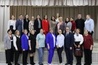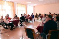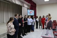 За дружеской беседой за столом собрались учащиеся 8 «А» класса, директор школы Елена Дмитриевна Кугаевская и учитель Марина Юрьевна Стерликова.
